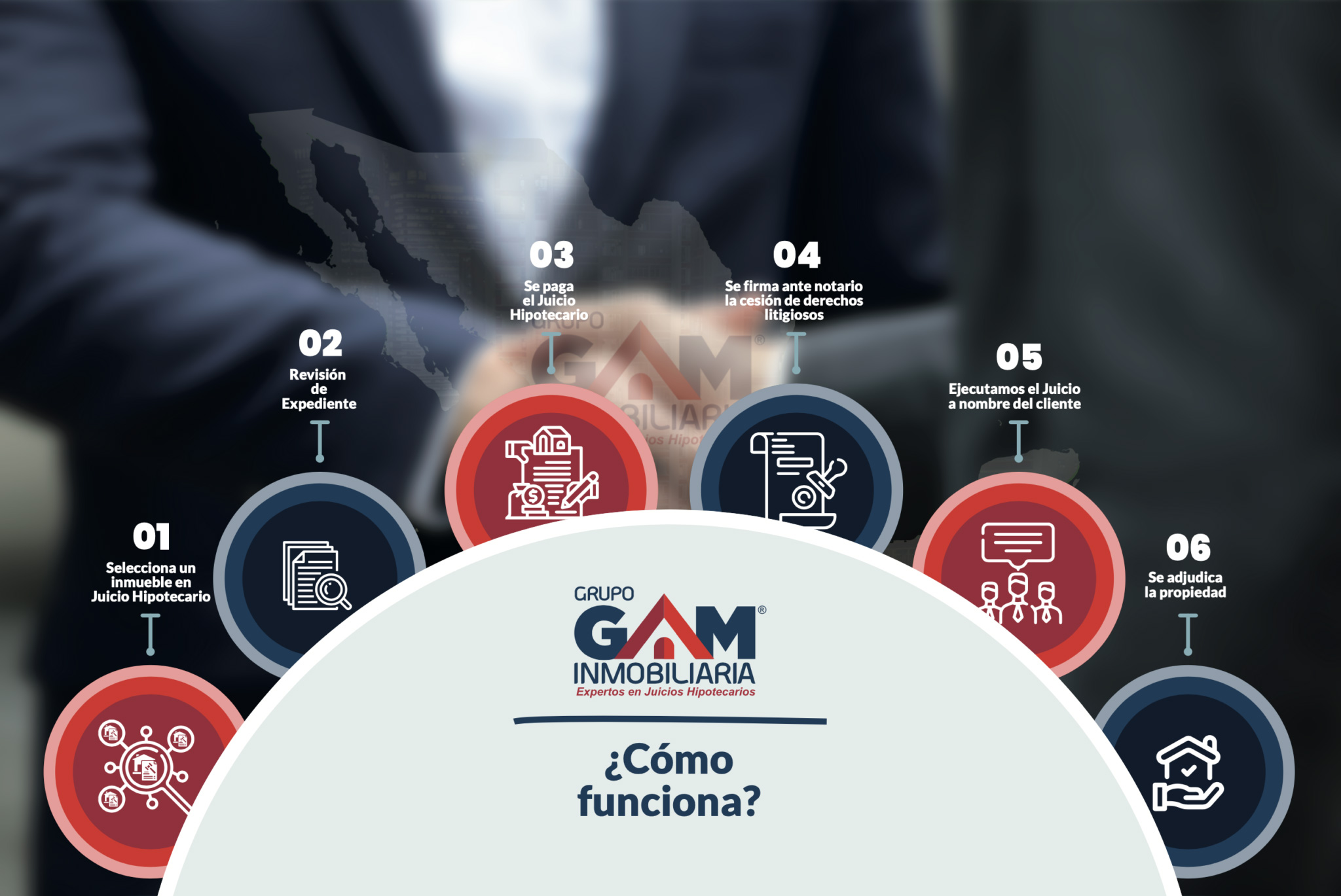 Grupo Gam Inmobiliaria desde 2018 y constituida como una SAPI, es una empresa dedicada a cambiar la perspectiva y promover la compra, venta e inversión en Juicios Hipotecarios, siendo actualmente una de las empresas más reconocidas, destacadas y con mayor crecimiento en el ramo, teniendo presencia en las principales ciudades del país.